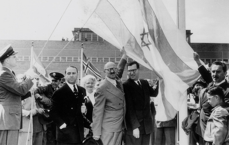 Suite à l'adoption de la résolution 181 de l'ONU, Moshe Sharett, Abba Eban et David Hacohen hissent ce qui deviendra le drapeau israélien au siège des Nations Unies à New York, le 29 novembre 1947. Photo: GPO