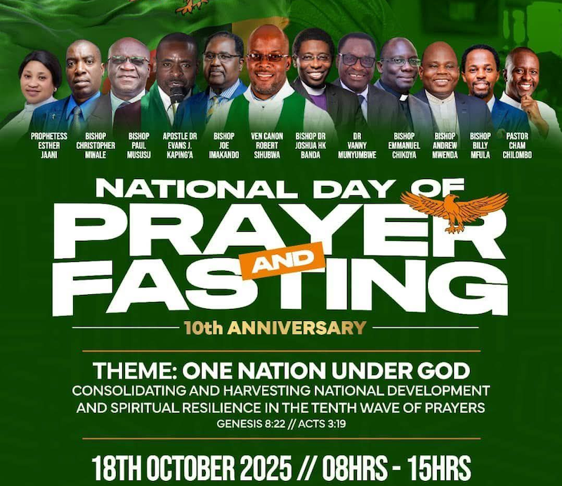 Chaque année, le 18 octobre, la Zambie s'arrête pour prier, jeûner et réfléchir. Les drapeaux sont en berne, des hymnes résonnent dans les églises… les bars et restaurants sont fermés, comme la plupart des lieux publics, c’est la Journée nationale de prière, de jeûne et de réconciliation (National Day of Prayer, Fasting and Reconciliation) elle a été conçue comme une pause dans la vie politique et pour ramener le pays sur le chemin de l'unité et de l'ordre constitutionnel.