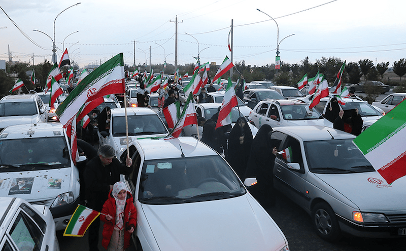 Image de propagande diffusée par l’agence de presse officielle iranienne (photo : Hossein Shah Badaghi) : À l'occasion du 12 Farvardin, un cortège de voitures d'habitants de Qom défile sur le boulevard rituel du Prophète.