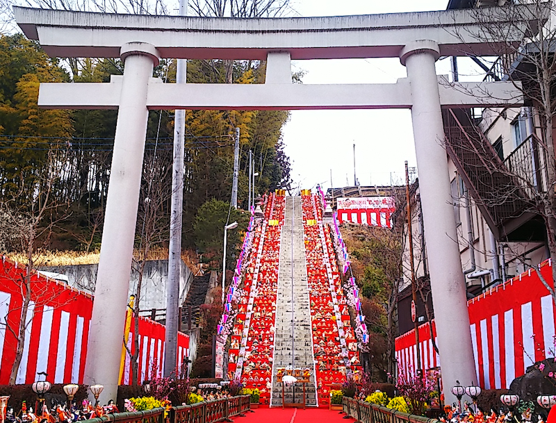 Poupées d’Hinamatsuri sur l’escalier « des cent marches » sur le chemin du sanctuaire Jusansho à Daigo, district de Kuji, préfecture d'Ibaraki (photo : Matsumotonaiko).