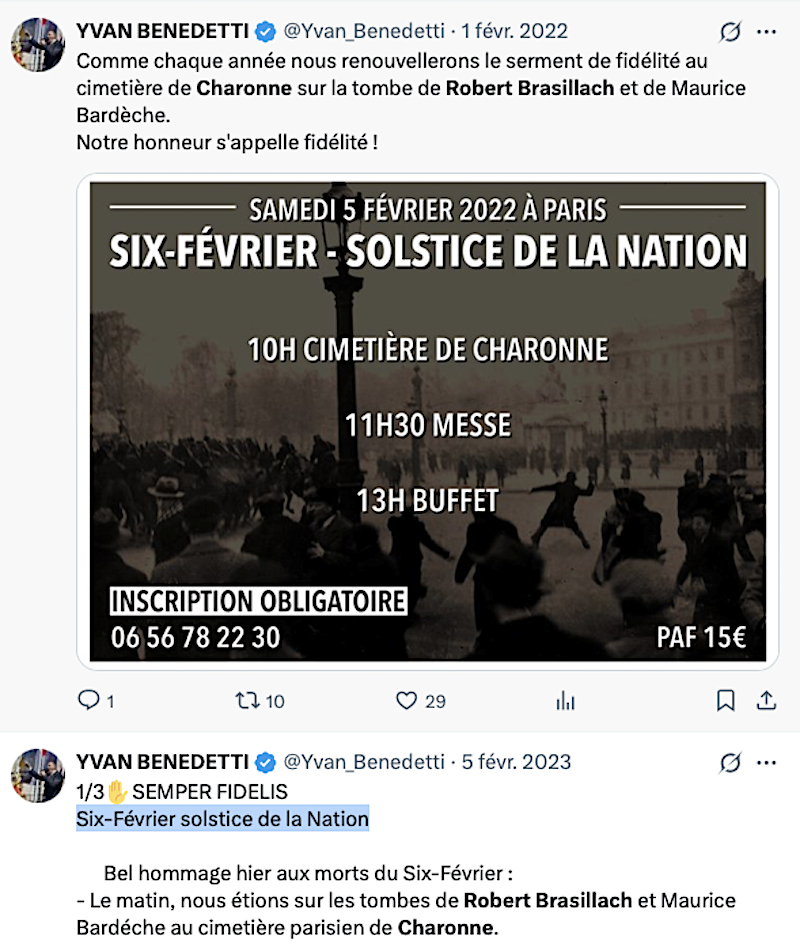 Pour les partisans de l’Algérie Française, le 6 février est aussi le souvenir de la “journée des tomates”. Le président du Conseil, Guy Mollet (socialiste), est en tournée à Alger lorsqu’il est violemment pris à partie par les partisans de l’Algérie française. Certains émeutiers du 6 février 1934, seront parmi les putschistes du 13 mai 1958… Le 6 février 1959 (toujours la date fétiche), un Parti nationaliste est créé, par Pierre Sidos (fils d’un milicien collabo) il sera très vite interdit. Pierre Sidos fondera ensuite Occident avec de jeunes néofascistes comme Gérard Longuet et Alain Madellin, une organisation qui se réclame ouvertement de Robert Brasillach. Après sa dissolution, Occident sera remplacé par Ordre Nouveau (une référence nazie) et par le GUD, mouvement étudiant qui cultive tout ce sinistre héritage jusqu’à sa dissolution en 2024.